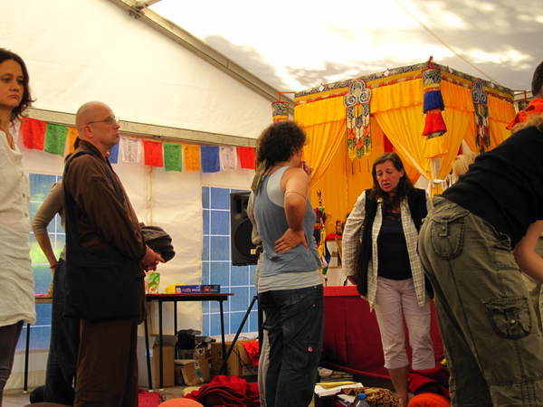 Obraz przedstawia rytuał buddyjski podczas wydarzenia Yeshe Khorlo w Polsce, z kolorowymi dekoracjami i tradycyjnymi elementami buddyjskimi.